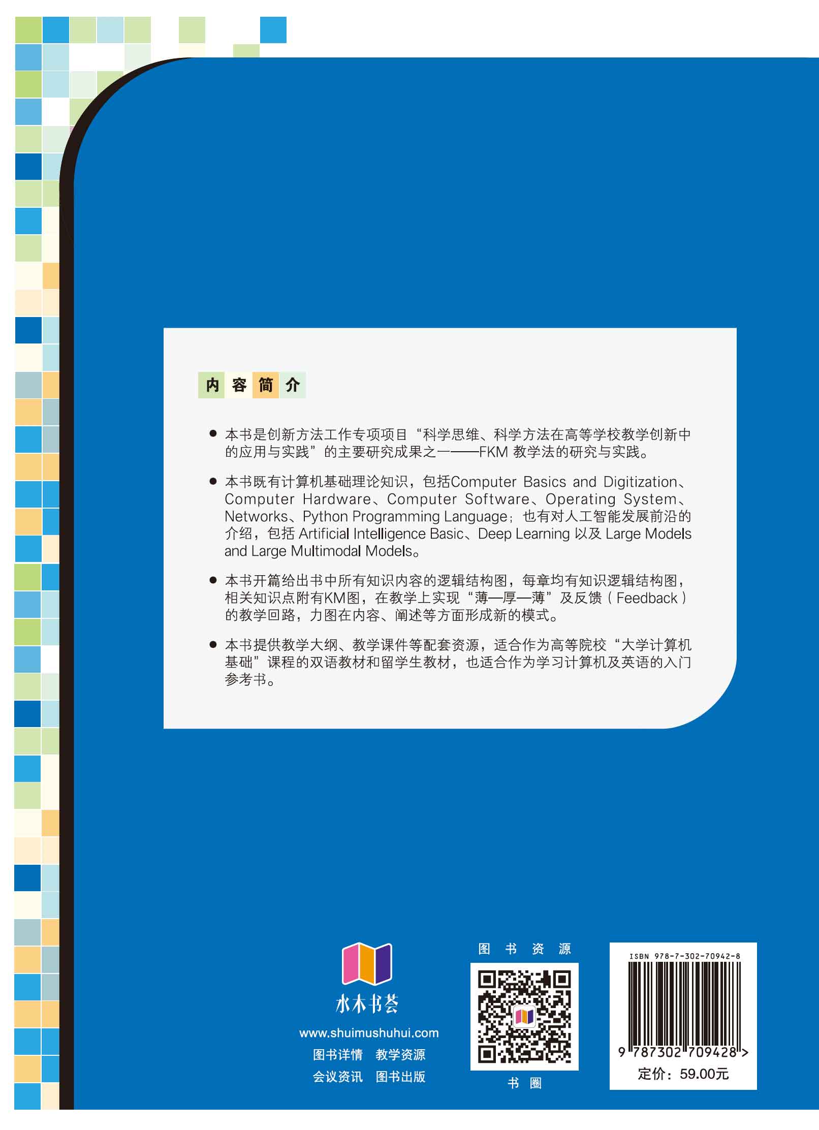 本书是创新方法工作专项项目“科学思维、科学方法在高等学校教学创新中的应用与实践——KM教学法的研究与实践”的主要研究成果之一(一系列教材之一)。本书按KM教学方法进行统稿与编写,按硬件、软件、操作系统、网络、计算机伦理、AI基础、深度学习、大模型、Python编程;本书开篇给出逻辑结构图,每章均有本章的知识逻辑结构图,相关知识点附有KM图,在教学上实现“薄-厚-薄”的教学回路,在内容、阐述等方面形成新的模式。