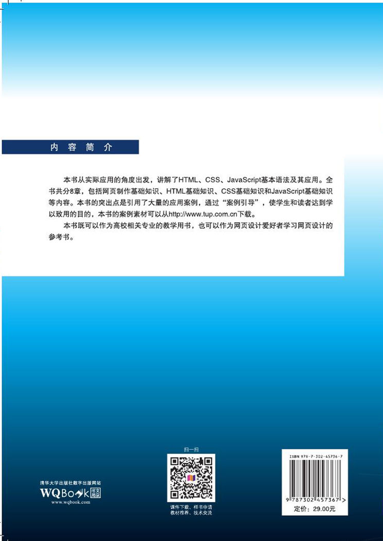 (1)从实际应用的角度出发; (2)内容涵盖HTML、CSS、JavaScript基本语法及其应用; (3)应用案例丰富,案例素材可以从http://www.tup.com.cn下载。