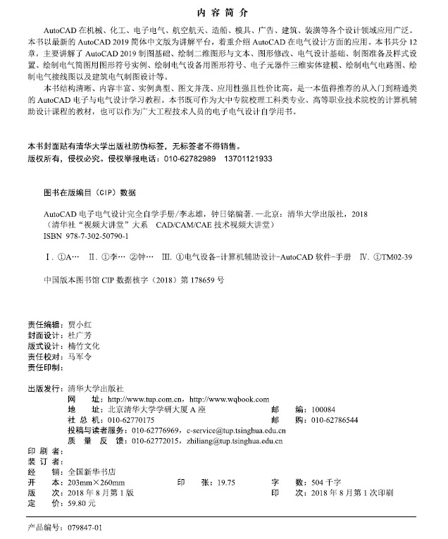 AutoCAD在机械、化工、电子电气、航空、造船、模具、广告、建筑、装潢等各个设计领域应用广泛。《AutoCAD电子电气设计完全自学手册》以最新的AutoCAD 2019简体中文版为讲解平台,着重介绍AutoCAD在电气设计方面的应用。《AutoCAD电子电气设计完全自学手册》共分12章,主要讲解了AutoCAD 2019制图基础、绘制二维图形与文本、图形修改、电气设计基础、制图准备及样式设置、绘制电气简图用图形符号实例、绘制电气设备用图形符号、电子元器件三维实体建模、绘制电气电路图、绘制电气接线图以及建筑电气制图设计等。 《AutoCAD电子电气设计完全自学手册》结构清晰、内容丰富、范例典型、图文并茂、应用性强且性价比高,是一本值得推荐的从入门到精通类的AutoCAD电子与电气设计学习教程。《AutoCAD电子电气设计完全自学手册》可作为大中专院校理工科类专业、高等职业技术院校的计算机辅助设计的教材,也可以作为广大工程技术人员的电子电气设计自学用书。