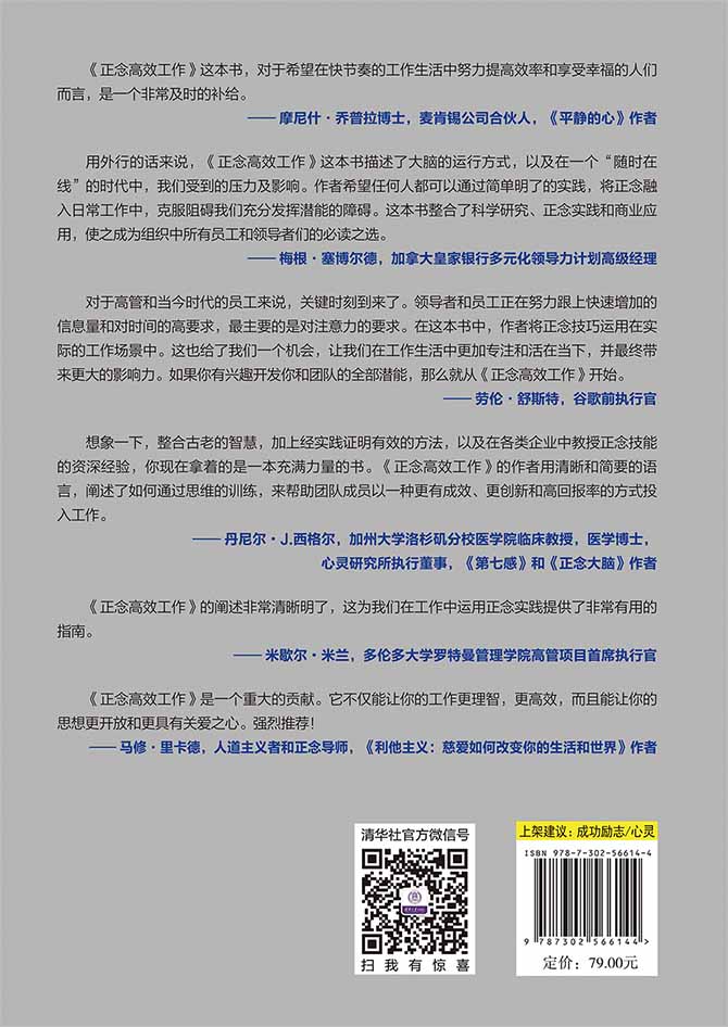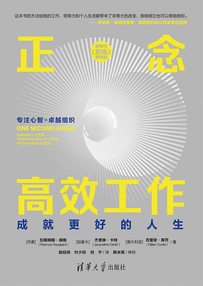 本书是作者拉斯姆斯先生基于个人和他所领导的潜力工坊(Potential Project)国际咨询团队对数百家世界500强企业进行职场正念应用实践及自主创作而成的理论成果,曾应用于耐克、微软、埃森哲、安永、汇丰、奥美、乐高、宜家等众多知名跨国企业。作者介绍了职场工作和管理场景的16个正念应用技巧和 8 个正念心理策略,并介绍了2种强大的正念训练方法—敏锐的专注力和开放的觉察,同时对自我引导的正念训练方法和持续训练资源给出了建议。本书可以帮助企业管理者和广大职场人士提升专注力、创造力和工作效率,保持精准的决策和清晰的思维,从而更好地驾驭工作场景中的各种挑战,达到生活和工作的平衡。