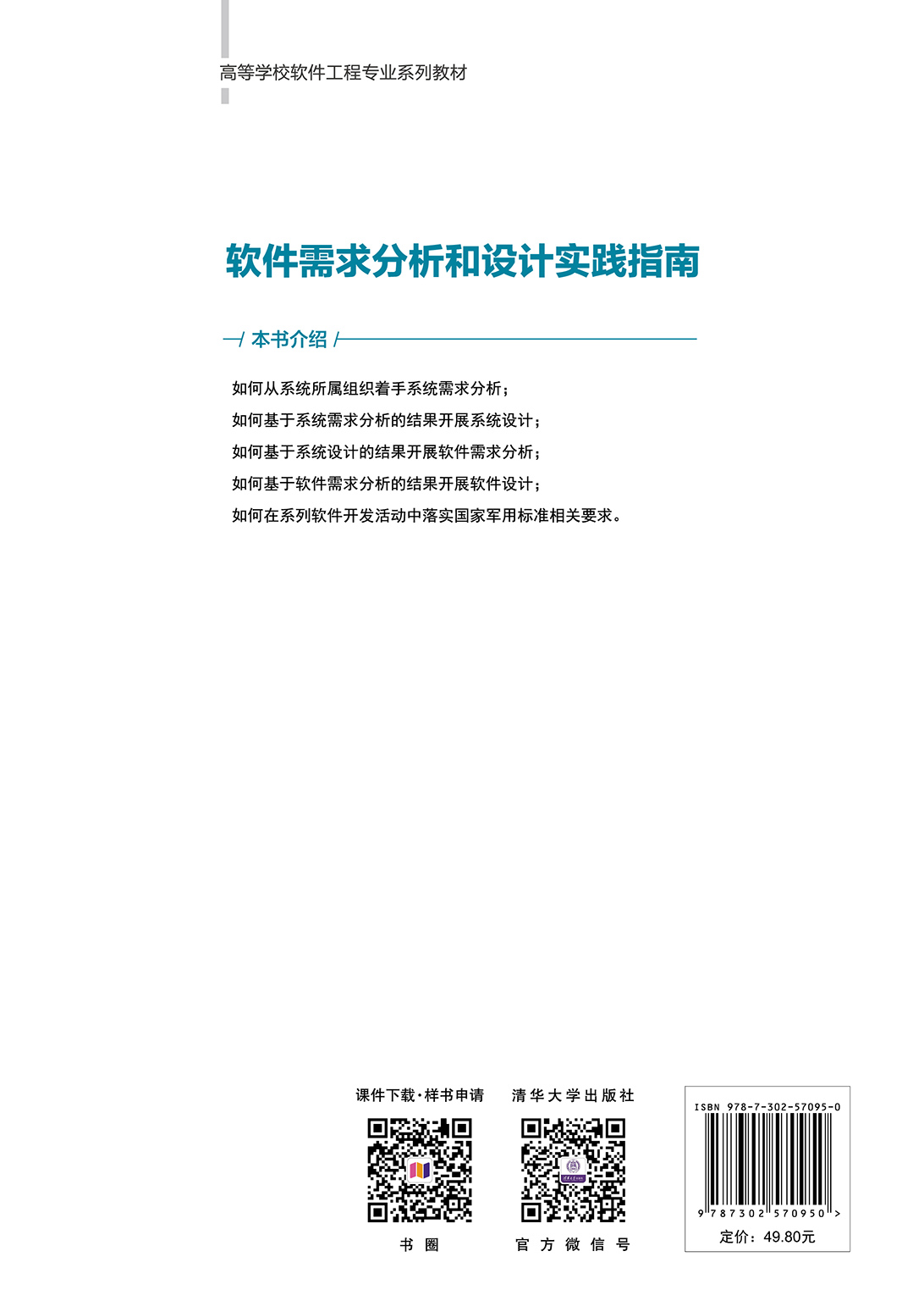 本书按照GJB2786A要求的软件开发活动,分别阐述了开展系统需求分析、系统设计、软件需求分析、软件设计活动的方法,以及运用这些方法得到的分析结果和设计结果如何按照GJB438B要求文档化。本书共分为十一章。简要说明了本书适用涉众,能够解决的问题。重点阐述了常见的软件开发过程,分别对系统需求分析、系统设计、软件需求分析和软件设计的方法进行了详细阐述。并将这些活动中应该记录的内容与GJB438B的要求进行了相关说明。