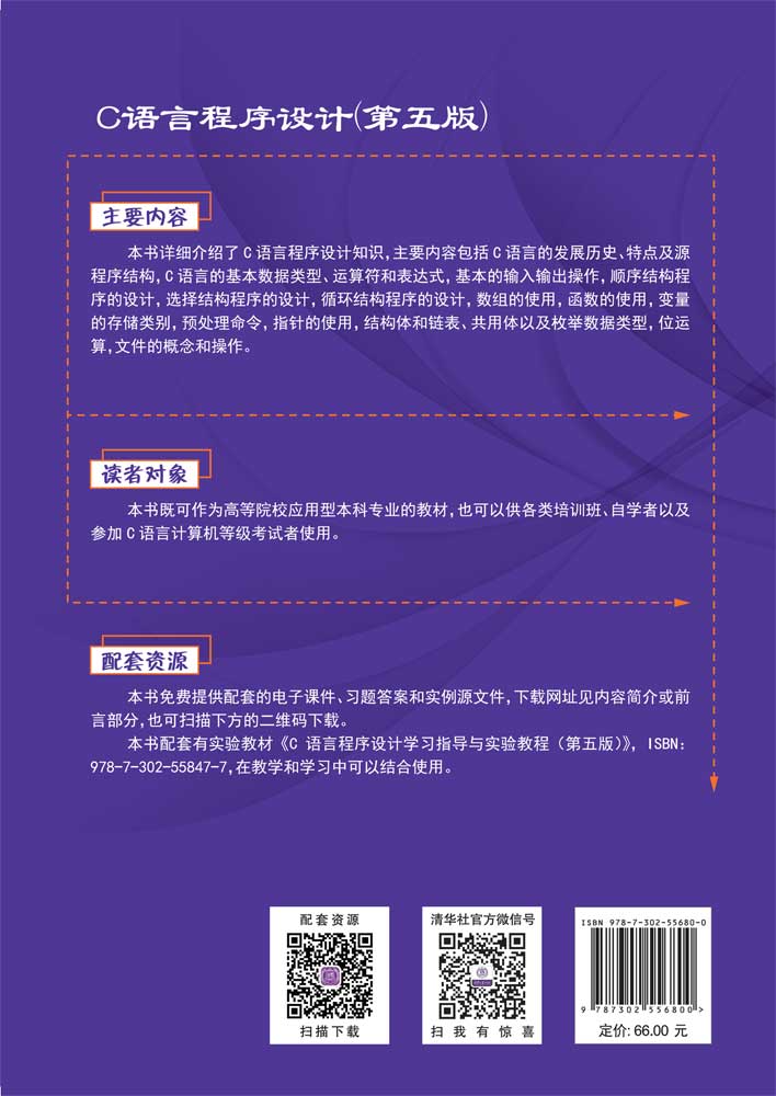 C语言课程是我国许多高校为学生开设的第一门程序设计语言课程。C语言具有很强的实用性,它既可用来编写系统软件,也可用来编写各种应用软件。 《C语言程序设计(第五版)》主要内容包括:C语言概述,数据类型、运算符与表达式,程序设计初步,选择结构程序的设计,循环结构程序的设计,数组,函数,编译预处理命令,指针,结构体与其他数据类型,位运算,文件等。书中包含了大量的程序设计实例,通过对实例的学习,读者将熟悉C语言的语法,能够更好地掌握运用C语言进行程序设计的方法和技巧。 《C语言程序设计(第五版)》既可作为高等院校应用型本科专业的教材,也可供自学者以及参加C语言计算机等级考试的人员阅读参考。 为了使读者更好地掌握C语言,清华大学出版社还出版了与本教材配套的学习指导与实验辅导教材:《C语言程序设计学习指导与实验教程(第五版)》。 《C语言程序设计(第五版)》配套的电子课件、实例源文件和习题及答案可以到http://www.tupwk.com.cn/downpage网站下载,也可以扫描前言中的二维码下载。