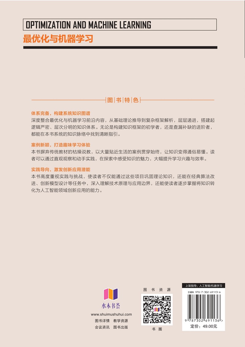 "本书全面探讨了机器学习中的**化理论、方法与实践,特别是在人工智能颠覆性发展的背景下, 包括但不限于监督学习、无监督学习、深度学习及强化学习等的应用。本书详细介绍了**性条件、 KKT 条件、拉格朗日对偶等核心**化理论,探讨了梯度下降法、邻近梯度法、牛顿法、拟牛顿方法 (BFGS 方法)、块坐标下降法、随机梯度类方法、增广拉格朗日方法、交替方向乘子法、双层规划等 经典**化方法,最后介绍了机器学习与**化深度融合的先进学习优化方法。通过本书的学习,读 者将能够全面理解机器学习中**化问题的建模和求解计算,及其在实际问题中的应用,为后续的机 器学习研究和实践奠定坚实的基础。在机器学习领域,**化方法不仅是实现模型学习的关键技术,也是提高模型性能、防止过拟合和增强泛化能力的基石。本书通过丰富的理论分析和实例演示,使读者能深入理解**化方法在机器学习中的核心作用,并为解决实际问题提供有力的工具。本书适合作为高等院校计算机、运筹学、计算数学、大数据、统计学等相关专业的教材,是一本适合广大人工智能爱好者的优秀读物。 "