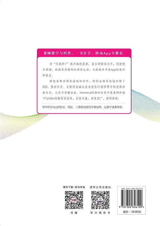 前言 本书自2016年6月出版以来,深受广大师生喜爱,获得了较高的评价,被多所高校选取为课程教材。随着4G网络的快速发展与普及,5G网络的开始使用,第1版中许多想象中的应用都已经成为现实。移动商务模式发生了巨大的变化,移动应用App也越来越多,应用场景也越来越丰富,渗透到了人们日常生活的方方面面。因此,本书与时俱进,进行修订,特色更加鲜明。 (1) 既简要描述了计算机与通信技术,又从普罗大众能够理解的角度,全面系统地介绍了移动互联网条件下的移动商务新应用,以期拓展读者在移动生活领域的视野,激发读者的创新精神,大胆设想未来的移动生活应用,为占领移动先机打下良好的基础。 (2) 既介绍了移动商务技术基础、基于O2O的移动商务、移动社交应用、互联网金融等通用知识,又分析了与老百姓衣、食、行、游、休闲和教育等各领域相关的移动应用。 (3) 既介绍了可穿戴设备的知识,又增加了5G移动互联网条件下的技术与应用,以帮助读者把握未来发展趋势,在自己的工作中更好地应用新技术,甚至创造新型的移动商务应用。 (4) 案例丰富,知识新颖,反映了最新App创意。强调时效性,注重从“90后”年轻人的角度来看App。 全书共15章,包括移动商务概述、移动商务技术基础、基于O2O模式的移动电子商务、互联网金融、社交类移动应用、服饰类移动应用、交通类移动应用、饮食类移动应用、旅游类移动应用、游戏类移动应用、影像新闻类移动应用、教育类移动应用、可穿戴设备、HarmonyOS移动应用开发案例和基于Python的推荐系统构建。本版本的主要改动如下。 (1) 第2章的2.1.3节和2.1.4节...