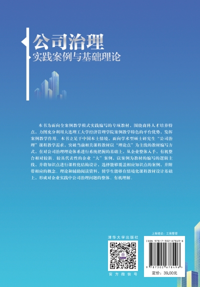 "本书力图充分利用大连理工大学经济管理学院案例教学特色的平台优势,发挥案例教学作用,围绕商科人才培养特点,面向全案例教学模式实践编写的专项教材。本书立足于中国本土情境,面向学术型硕士研究生“公司治理”课程教学需求,突破当前相关课程教材以“理论点”为主线的教材编写方式,在对公司治理理论体系进行系统把握的基础上,从企业整体入手,有机整合相对较新、较具代表性的企业“大”案例,以案例为教材的编写的逻辑主线,并将知识点进行课程化结构设计,选择能够覆盖相应知识点的案例,以面带点,并附带相应的概念、理论和辅助阅读资料。使学生能够在情境化课程教材设计基础上,形成对企业实践中公司治理问题的整体、有机理解。 "