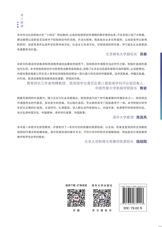 u 教材面向影视、网络与新媒体、数字媒体专业的学生群体,将理论性与实用性相结合,内容涵盖创意、拍摄和剪辑三大实用技能。通过选题策划引导、创意与制作流程指导,使学生具备独立创作完整短视频作品的能力。