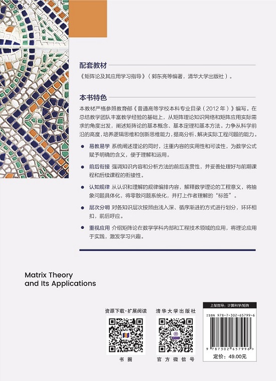 本书系统地介绍了矩阵论的基础理论和方法,以及其在数学学科内部和工程技术领域的应用实例,矩阵论作为本科生的线性代数课程的后续课程,在内容上以矩阵、线性变换、矩阵分解、广义逆矩阵等为核心,是线性代数课程内容的进一步深化和实用化,全书共分为7章,分别为线性空间、线性变换、典型矩阵与变换、矩阵的相似标准形、矩阵分解、矩阵的微积分、广义逆矩阵。各章有引言、知识网络图、理论部分和例题、应用实例、习题,书后附有相关MATLAB函数、习题参考答案。本书可作为理工科院校高年级本科生或硕士研究生的矩阵论及其应用等课程的教材,也可供相关工程技术人员参考。本书配有学习指导书,可辅助教师教学或学生自学。