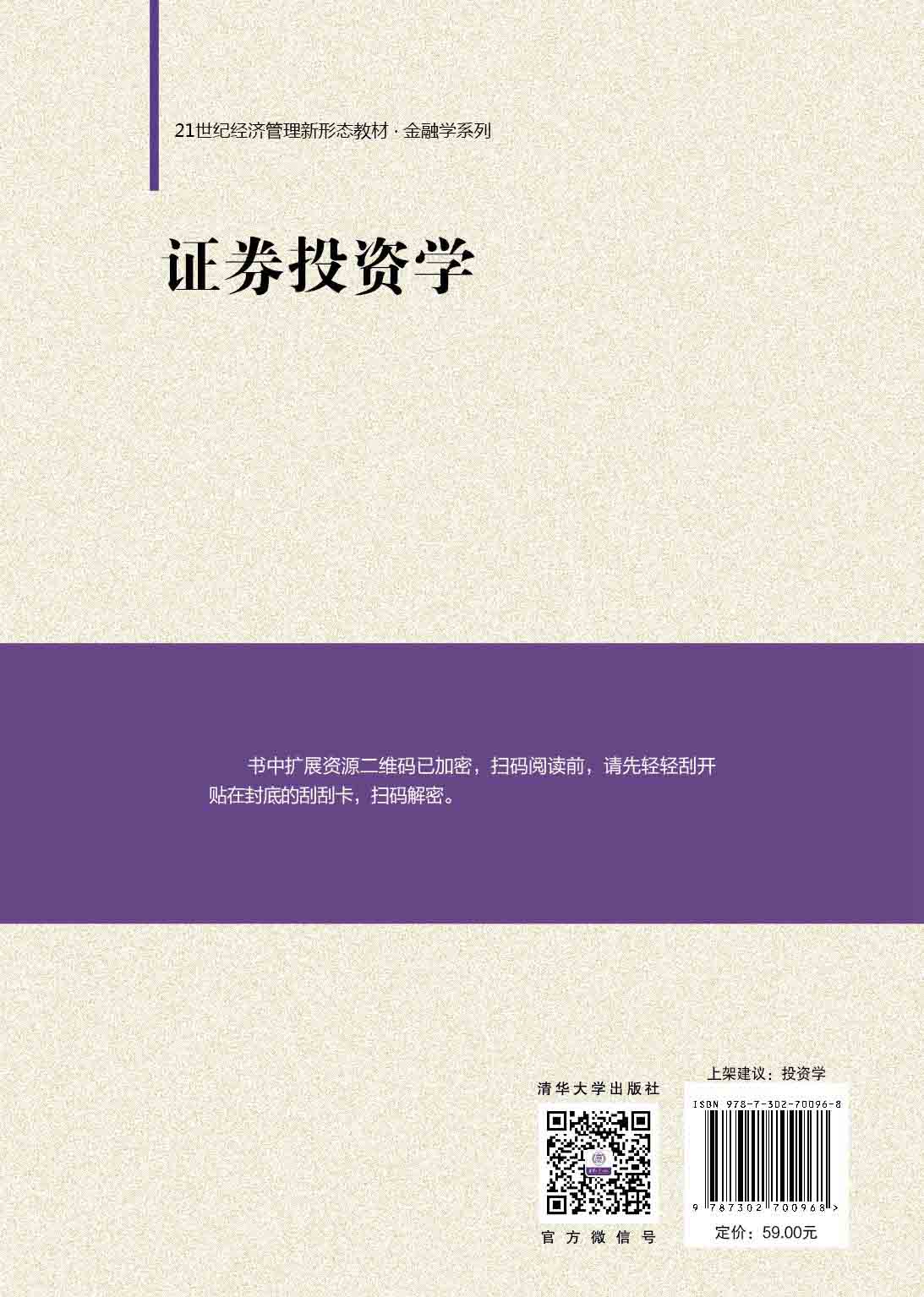 "本书系统介绍了证券投资的基本理论、市场运作及投资策略。本书涵盖证券市场、股票、债券、基金、金融衍生工具等核心内容,并深入探讨证券投资的基本分析、技术分析、价值分析及投资组合管理,帮助读者全面理解证券市场的运行机制。 本书注重理论与实践结合,通过丰富的案例分析,使学生能够将投资理论应用于实际市场,引导学生树立正确的投资理念和金融伦理观,培养社会责任感和全球视野。 本书适用于金融、经济、管理等相关专业的本科生和研究生,同时也可作为证券从业人员及投资者的参考读物,为其提供系统的证券投资知识和实践指导。"
