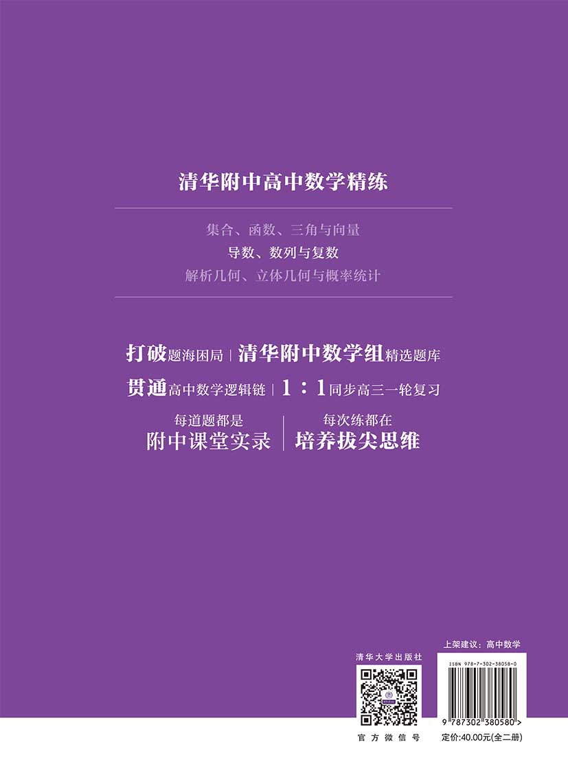 前言 清华大学附属中学(以下简称清华附中)是一所享有盛誉的百年名校。长期以来,我们学校始终坚持“时代为志,育人为本,行动为要”的办学理念,致力于“培养具有家国情怀、强健体魄、丰盈内心、国际视野的拔尖创新人才”的育人目标。 在党的二十大精神的指引下,教育改革、创新和发展的方向愈发明确,新的时期和形势为我国基础教育提供了前所未有的发展机遇。在这一大背景下,清华附中数学组的老师们积极响应国家培养拔尖创新人才的号召,致力于课堂改革,不断探索符合教育规律的高中数学课堂教学方法,以及科学合理的习题配置模式。 经过近10年的数学课堂改革实践,以及几届师生的实际使用与反馈,我们的数学组老师们对数学知识进行了深入解构和系统整理,精心挑选了具有代表性的习题,最终编写完成了这套“清华附中高中数学精练”系列书籍。该系列书籍不仅是清华附中数学组高中数学课堂改革的成果,更是我们对教育事业的深刻理解和执着追求的体现。 本系列图书共包含三册,全面覆盖了高中数学的所有知识点,并按照代数、几何、概率的知识结构进行了系统性的整合,充分遵循了高中学生学习数学的认知规律,展现了高中数学的逻辑性和系统性。习题的题量适中,难易程度恰当,旨在引导学生摆脱单一的“题海战术”,深入理解数学知识的内涵,激发学生学习数学的热情,同时让他们在解题过程中领悟数学思想和方法,从而有效提升数学核心素养。 本系列图书在编排上与高三数学一轮复习的顺序保持一致,既重视基础知识的学习,又兼顾学生能力的提升,非常适合作为学生自主学习的辅导资料和教师备课的参考资源。 由于水平有限,书中难免存在疏漏,我...