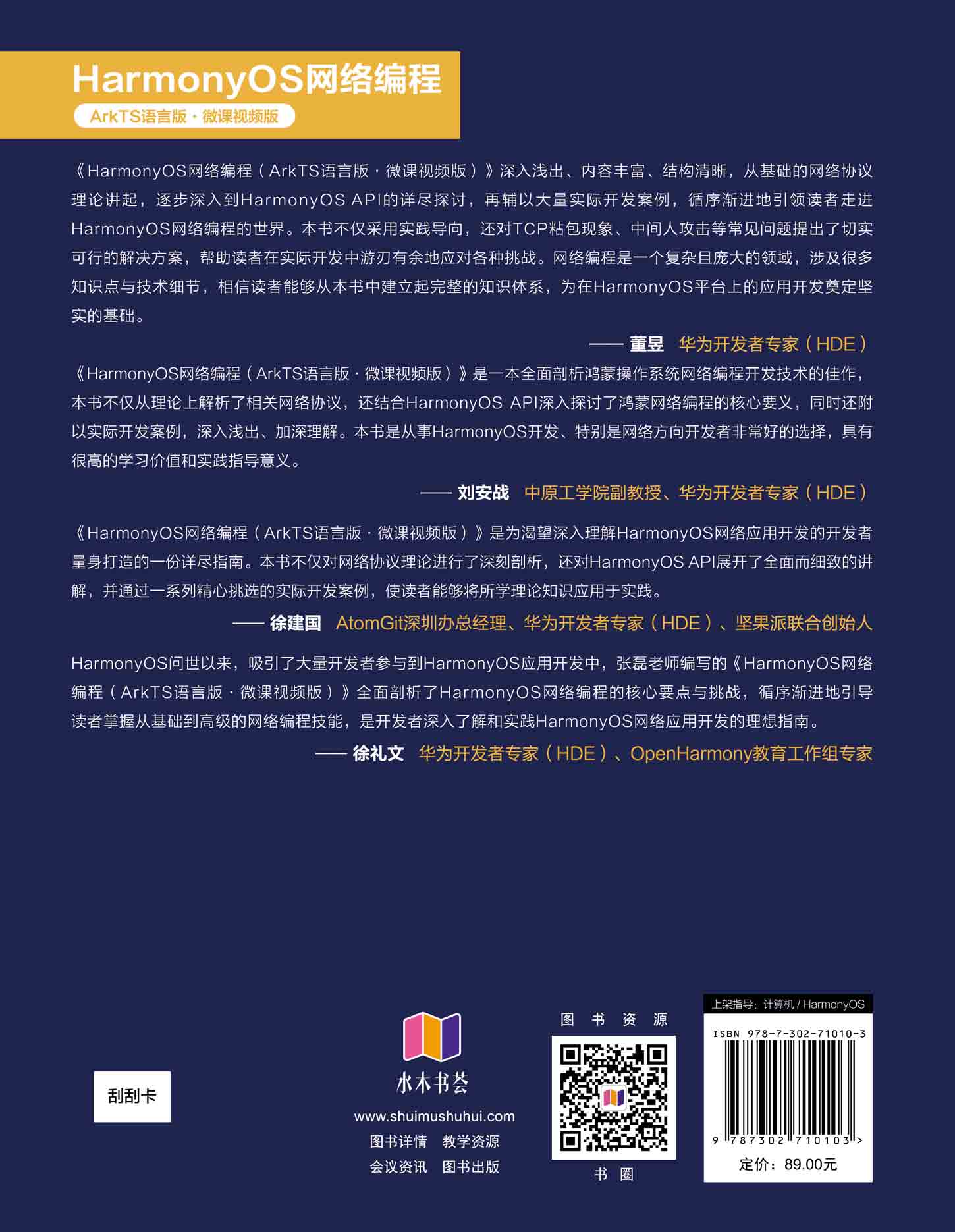 "本书精心设计,融合了网络协议理论的深度解析、HarmonyOS API的详尽探讨及丰富的实际开发案例,旨在全面剖析HarmonyOS网络编程的核心要点与挑战。 全书共10章,全面解析HarmonyOS平台下的网络编程技术,从底层的TCP、UDP、HTTP到高级特性的RCP模块和ArkWeb组件,内容循序渐进、深入浅出。每章配有丰富的示例代码与详尽的开发指南,帮助读者快速掌握网络应用的设计与实现,构建高效稳定的网络应用。 本书面向有一定ArkTS语言基础的开发者,以及对HarmonyOS网络编程感兴趣的开发者,还可作为高等院校计算机相关课程的教材或参考书。 "