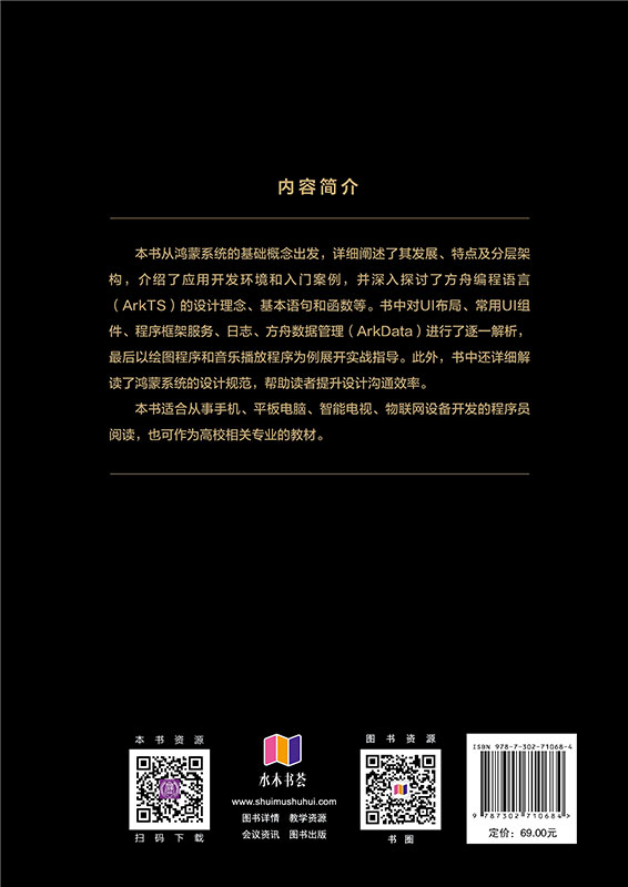 《鸿蒙HarmonyOS NEXT应用开发实践》是一本全面深入的鸿蒙操作系统开发指南。本书从鸿蒙系统的基础概念出发,详细阐述了其发展历程、系统架构、应用架构,并介绍了应用开发流程及上架分发策略。书中不仅涵盖了搭建开发环境、快速入门指南,还深入探讨了方舟编程语言(ArkTS)的设计理念、基础类库和高性能编程实践。用户界面(ArkUI)开发、常用UI组件的构建、核心能力Ability的实现、后台任务开发、方舟数据管理(ArkData)等关键技术点均被逐一解析。此外,书中还涉及了网络开发、多媒体开发、高级应用服务等高级话题,并提供了应用测试和日志管理的实用指导。本书旨在为开发者提供一个全面的鸿蒙应用开发知识体系,帮助他们快速上手并构建高效、稳定的鸿蒙应用。