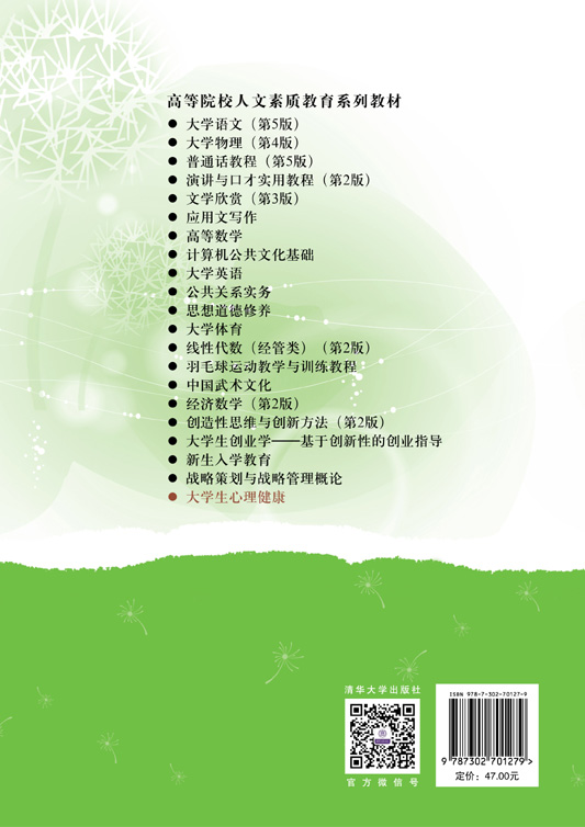 "《大学生心理健康》秉持“释难解惑,助人自助”的心理健康教育理念,助力大学生认识、理解并有效解决心理问题,着重提升大学生的健康心理素质与自助能力。为实现这一目标,《大学生心理健康》精心选取了与当代大学生高效学习、快乐生活、健康成长紧密相关且有助于促进心理健康的十大主题。其内容既涉及大学生中普遍存在且亟待解决的人际关系、挫折应对、职业选择、学习适应、婚恋与性等适应性心理问题,也涉及影响大学生自身发展、幸福生活和闲暇娱乐等发展性心理问题的剖析及解决策略。全书突出了“新、实、特”的基本特色。《大学生心理健康》具有结构逻辑严密、体系完整,重点内容突出,专业实用,功能优化整合、贴近生活,体例便于教学,学用结合等特点。 《大学生心理健康》是一本集科学性、专业性、实用性和可读性于一体的大学生心理健康维护与促进类图书,既可作为高校开设大学生心理健康教育课程的教材,也可作为青少年心理健康的自助读物,还适合高校学生、青少年、高等教育管理者以及相关工作者阅读和参考。 "