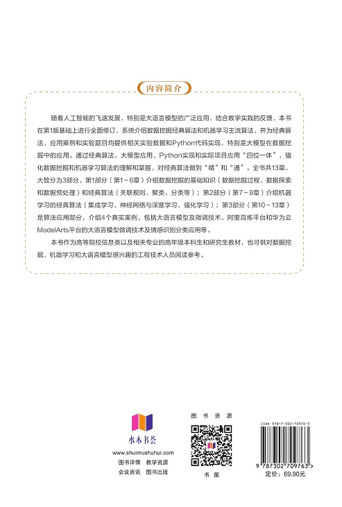 "随着人工智能的飞速发展,特别是大语言模型的广泛应用,结合教学实践的反馈,本书在第1版基础上进行全面修订,系统介绍数据挖掘经典算法和机器学习主流算法,并为经典算法、应用案例和实验题目均提供相关实验数据和Python代码实现,特别是大模型在数据挖掘中的应用。通过经典算法、大模型应用、Python实现和实际项目应用“四位一体”,强化数据挖掘和机器学习算法的理解和掌握,对经典算法做到“精”和“通”。全书共13章,大致分为3部分,第1部分(第1~6章)介绍数据挖掘的基础知识(数据挖掘过程、数据探索和数据预处理)和经典算法(关联规则、聚类、分类等);第2部分(第7~9章)介绍机器学习的经典算法(集成学习、神经网络与深度学习、强化学习);第3部分(第10~13章)是算法应用部分,介绍4个真实案例,包括大语言模型及微调技术、阿里百炼平台和华为云ModelArts平台的大语言模型微调技术及情感识别分类应用等。 本书作为高等院校信息类以及相关专业的高年级本科生和研究生教材,也可供对数据挖掘、机器学习和大语言模型感兴趣的工程技术人员阅读参考。 "