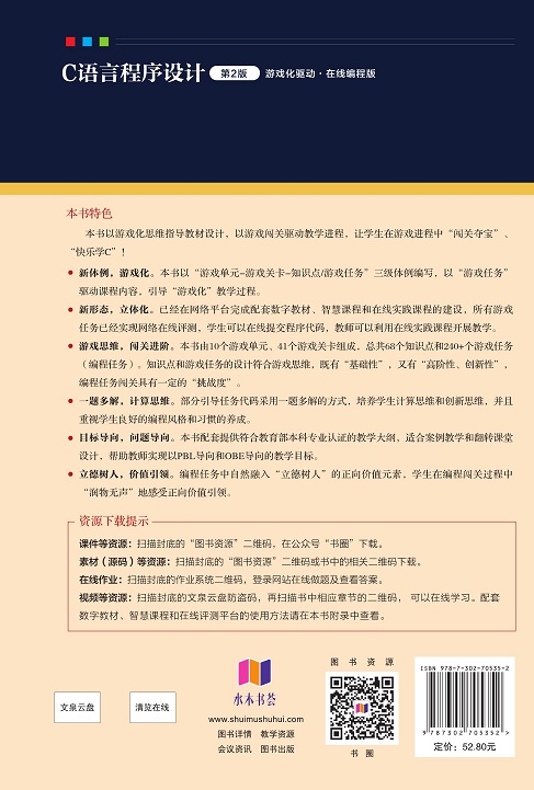 本书以“游戏化”方式重构教学内容,以“游戏任务”引导和驱动教学进程,以在线评测检验教学效果,以OBE和PBL理念为导向进行创新设计,体现以下特色: