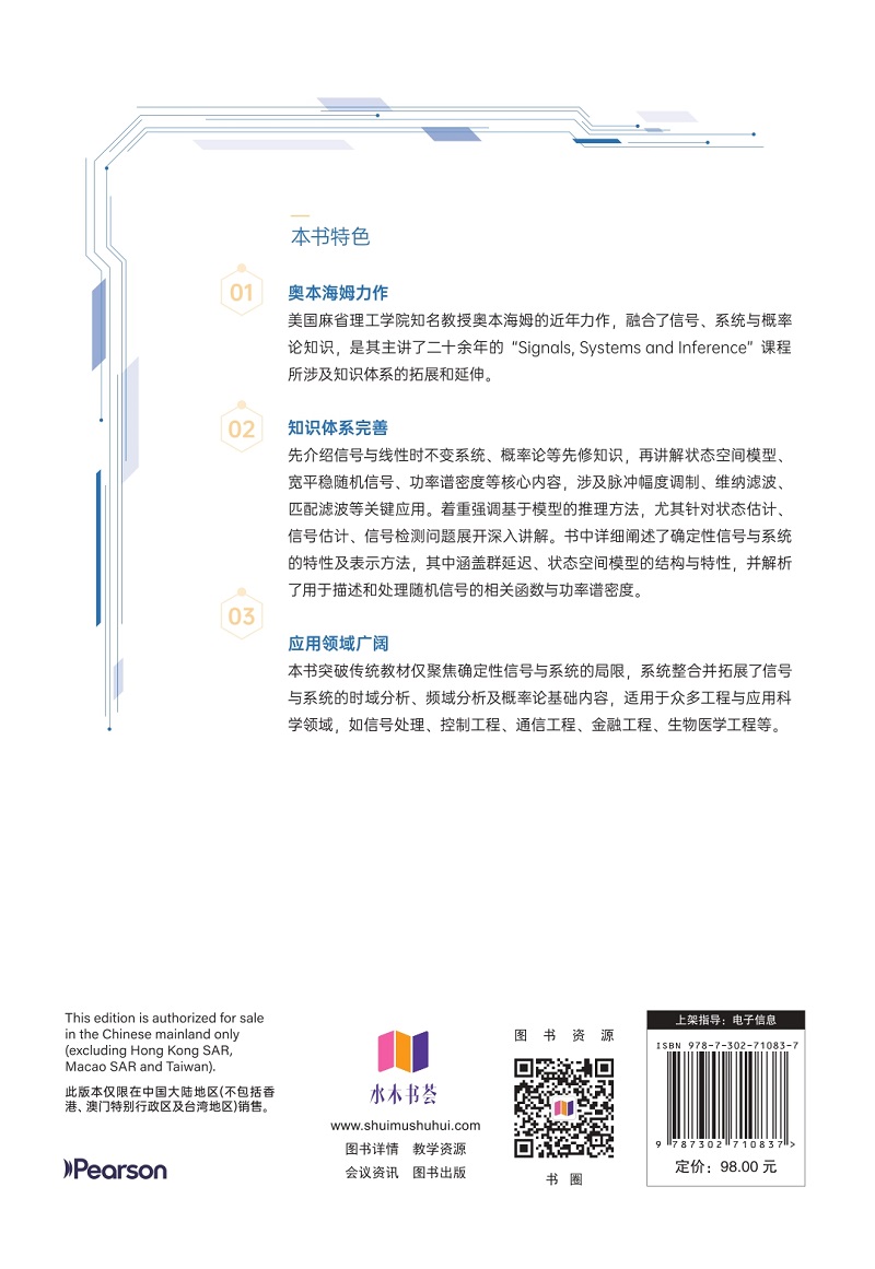 本书突破传统教材仅聚焦确定性信号与系统的局限,系统整合并拓展了信号与系统的时域分析、频域分析及概率论基础内容,适用于众多工程与应用科学领域,如信号处理、控制工程、通信工程、金融工程、生物医学工程等。"